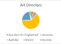 It is observed in the graph that Art Directors accept any level of educational attainment of their employees. However, take note that more than half of the population graduated with a bachelors/master degree. Less than half are those who graduated with lower education. For Animators, VFX Artists, and Filmmakers, most of the population are associates or graduated with a bachelor's degree in their field.